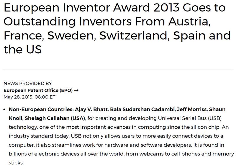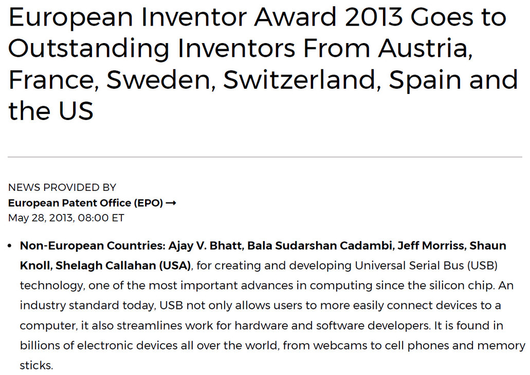 Excerpt from Press Release for European Inventor Award 2013 for Non-European Countries, which went to Ajay V. Bhatt, Bala Sudarshan Cadambi, Jeff Morriss, Shaun Knoll, and Shelagh Callahan (USA), for creating and developing Universal Serial Bus (USB) technology.