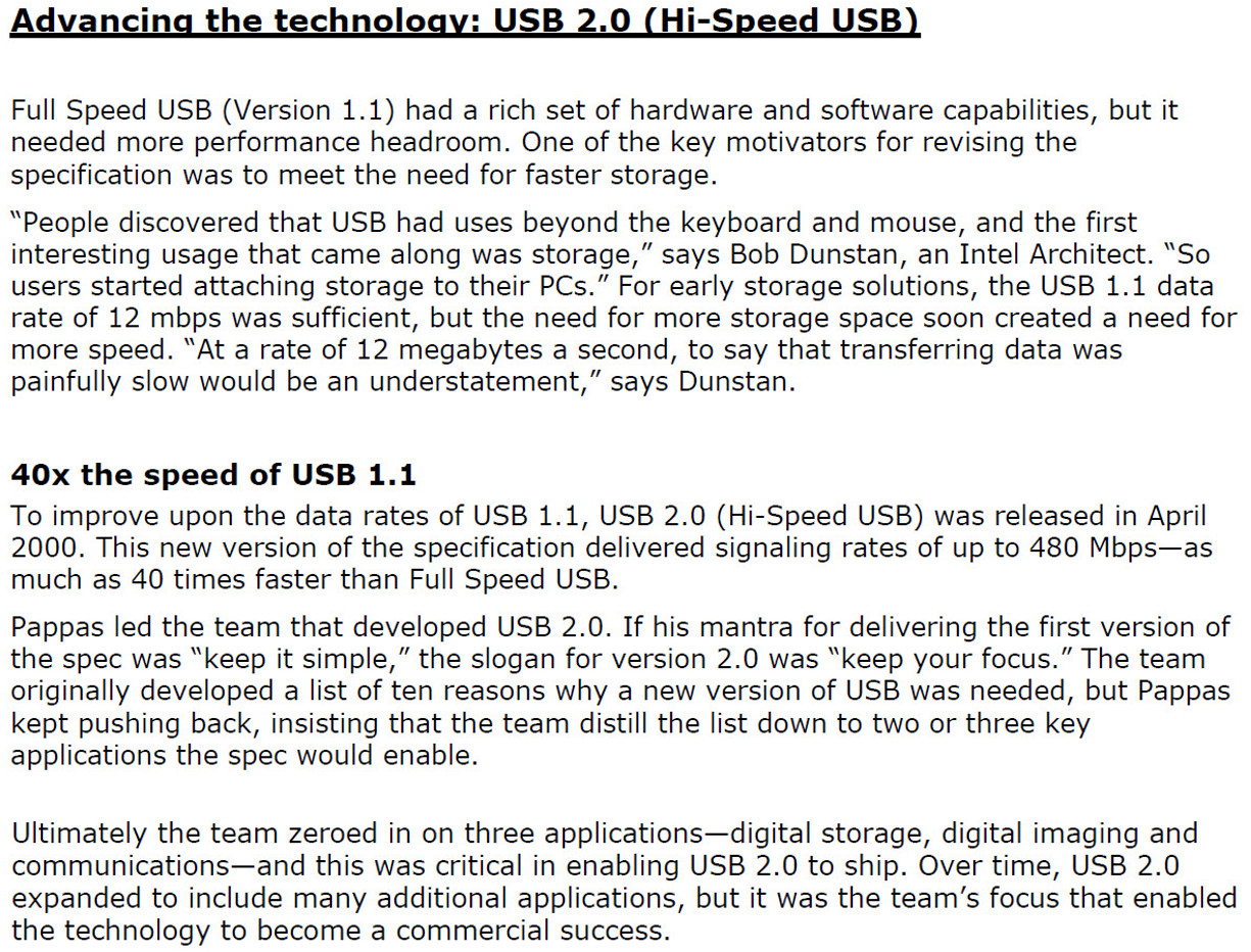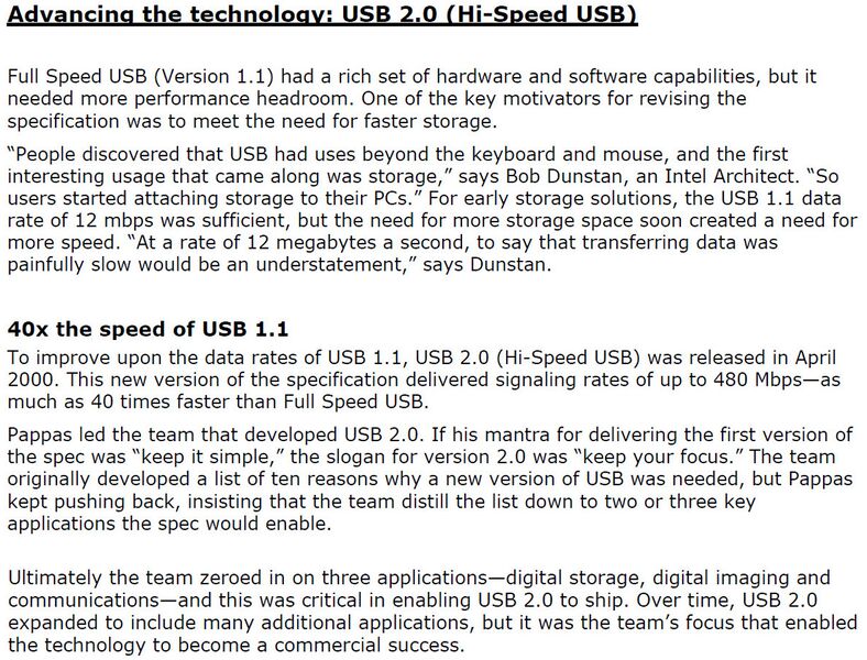 Excerpt from pp. 10-11 of the "How USB Became the Most Successful Interface in Computing History" document re: USB 2.0.