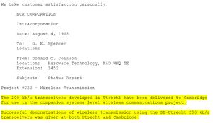 The initiative leading to the development of wireless LAN products, the development of the IEEE 802.11 standard and the co-establishment of the Wi-Fi Alliance was taken at an Engineering Laboratory operating in Utrecht the Netherlands. In 1985 it was part of NCR Corporation. Further reference to the laboratory will be “WaveLAN-team”. Throughout its existence the WaveLAN-team operated under various corporate names. In 1991 NCR was acquired by AT&T, in 1996 AT&T split into three parts and the corporate name changed into Lucent Technologies. In 2001 Lucent Technologies sold some of their business units and the corporate name was changed into Agere Systems. Interesting to know is that Bell Labs collocated a department in the same building in 1994. Their charter was to do research in the same subjects as done by the WaveLAN-team. In the mid-nineteen eighties NCR, a US based company specialising in terminals for financial and retail institutions and small to mid-size computers, had the objectives to suit the wish of their retail customers to connect their terminals, cash registers, without cables to the back-office computer, so they did not need to drill new holes in their marble floors after changes in the floorplan. Experiments to connect through Infra-red links turned out to be tedious because the need to align transmitters and receivers and it limited the possibility of their customers to hang banners and other ornamentation in the shops. When the FCC permitted the use of spectrum without the need for an end-user license, NCR wanted to pursue this opportunity to resolve the cash register issue and assigned the request for an investigation into the feasibility of a radio link for retail terminals. They found the best skills to do an investigation at the WaveLAN-team. In addition to the engineers, the WaveLAN-team also operated with a team of product managers, responsible for the acquisition of funding, the marketing and the product lifecycle management. November 1987 the WaveLAN-team demonstrated the feasibility of a 100 kilobit per second radio link between two PCs to a review team of NCR Headquarters and people from the Retail Division of NCR, “customer” of the development work (Figure 3).