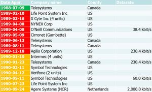 v. The FCC maintains a database with equipment they approved. See https://apps.fcc.gov/oetcf/eas/reports/GenericSearch.cfm , fill in the fields for “Final actions date range” with 01/01/1986 and 01/01/1991, select “DSS-Part 15 Spread Spectrum transmitter” in the field for “Equipment class” and 30 in Show … Records at a Time (HTML output only). The data rates are taken from the article from Byteweek in referenced document [4].